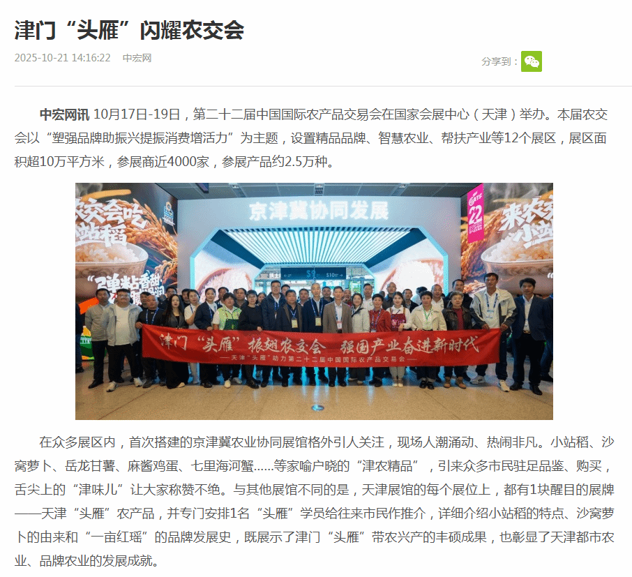 头雁兴农公众号报道“头雁”亮相丰收节 展示“津”秋好“丰”景